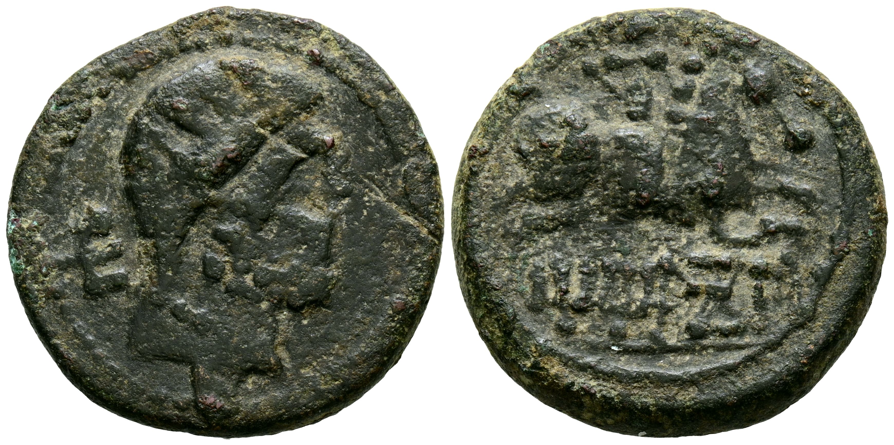 TITIACOS (Tricio, La Rioja). As. (Ae. 9.89g/24mm). 120-20 BC (FAB-2392). Anv: Bearded male head on the right, behind letter: Ti. Rev: Rider with lance to the right, below Iberian legend: TiTiACoS. Almost Very Fine.