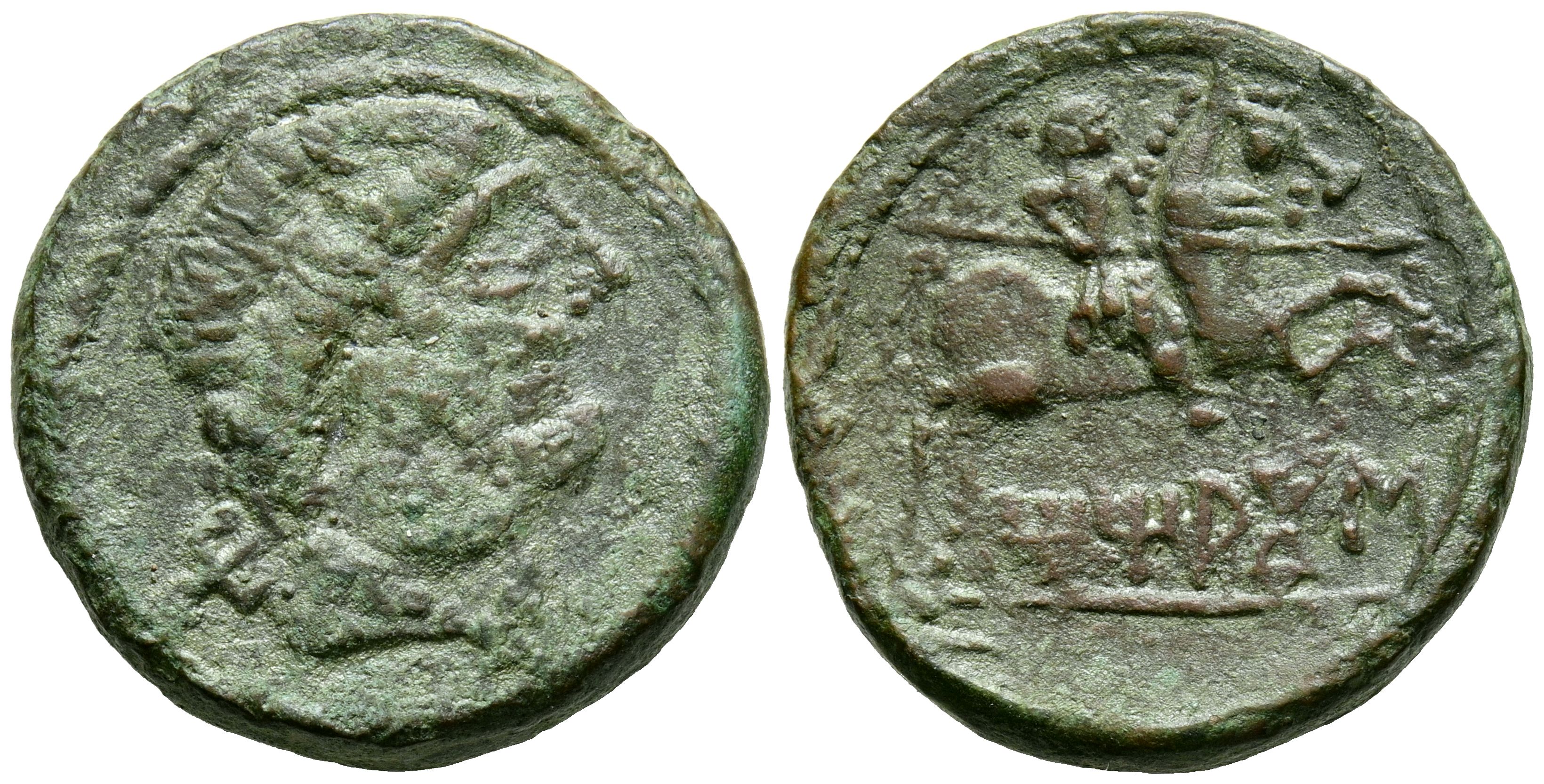 TITIACOS (Tricio, La Rioja). As. (Ae. 8.87g/23mm). 120-20 BC (FAB-2392). Anv: Bearded male head on the right, behind letter: Ti. Rev: Rider with lance to the right, below Iberian legend: TiTiACoS. Almost Very Fine.
