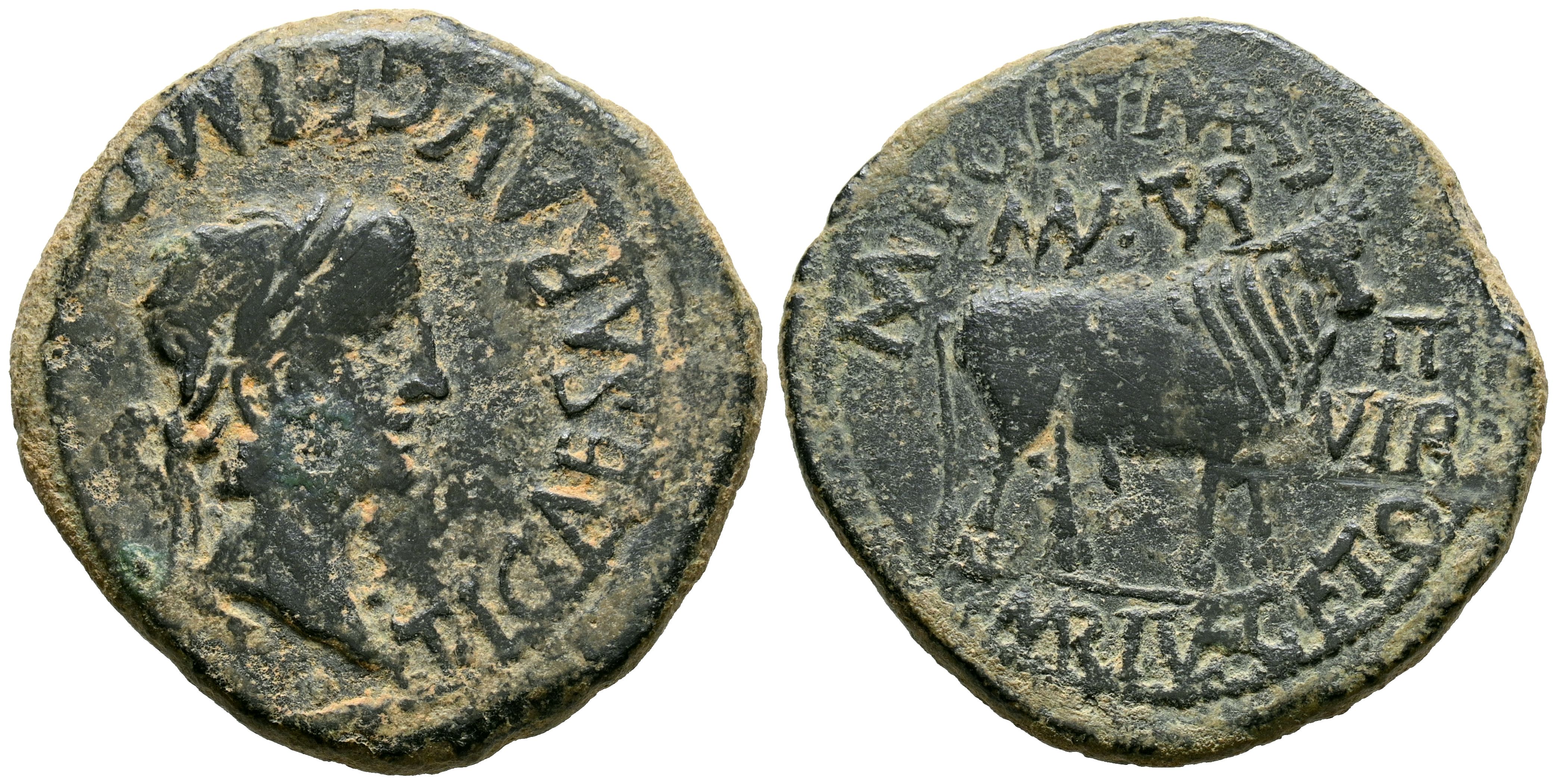 English TURIASO (Tarazona, Zaragoza). As. (Ae. 12.55g/30mm). 14-36 AD (FAB-2450). Anv: Laureate head of Tiberius to the right, around legend: TI CAESAR AVG F IMP PONT M. Rev: Bull on line, above: MVN TVR, in front: II VIR, around legend: M PONT MARSO C MARI VEGETO. Very Fine.