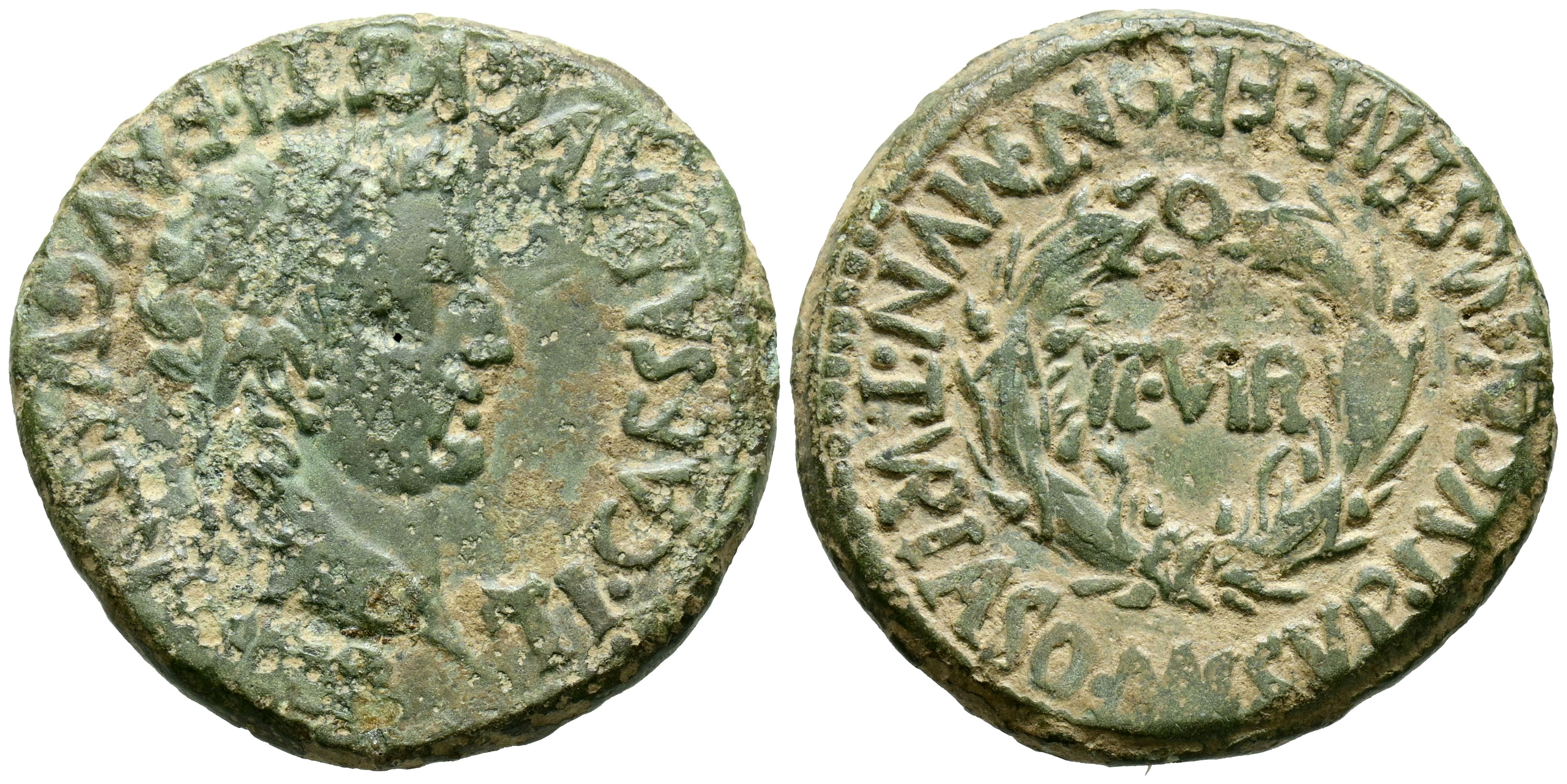 TURIASO (Tarazona, Zaragoza). As. (Ae. 12.27g/28mm). 14-36 AD (FAB-2455var; ACIP 3286d). Anv: Laureate head of Tiberius to the right, around legend: TI CAESAR AVGVSTI F AVGVSTVS IMP. Rev: II VIR, inside a laurel wreath, around legend: MVN TVRIASO MN SVLP LVCAN M SEMP FRONT. Very Fine.