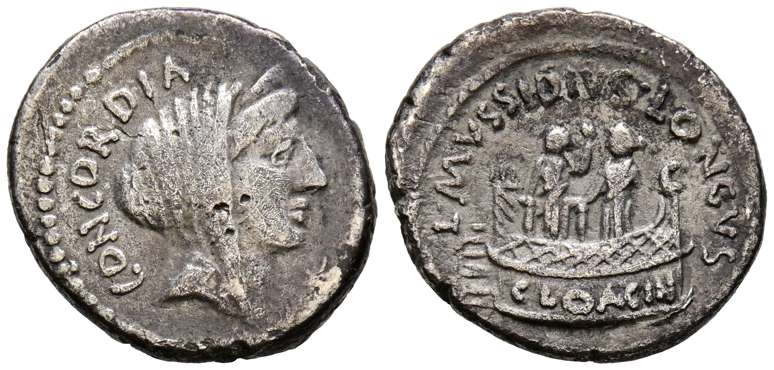 English GENS MUSSIDIA. Denarius. (Ar. 3.47g/19mm). 245-247 AD Rome. (Crawford 494/42; FFC 931). Anv: Diademed and veiled head of Concordia to the right, star in front, behind: CONCORDIA. Rev: Two characters in the polling place, where it reads: CLOACIN, around legend: L MVSSIDIVS LONGVS. Very Fine.