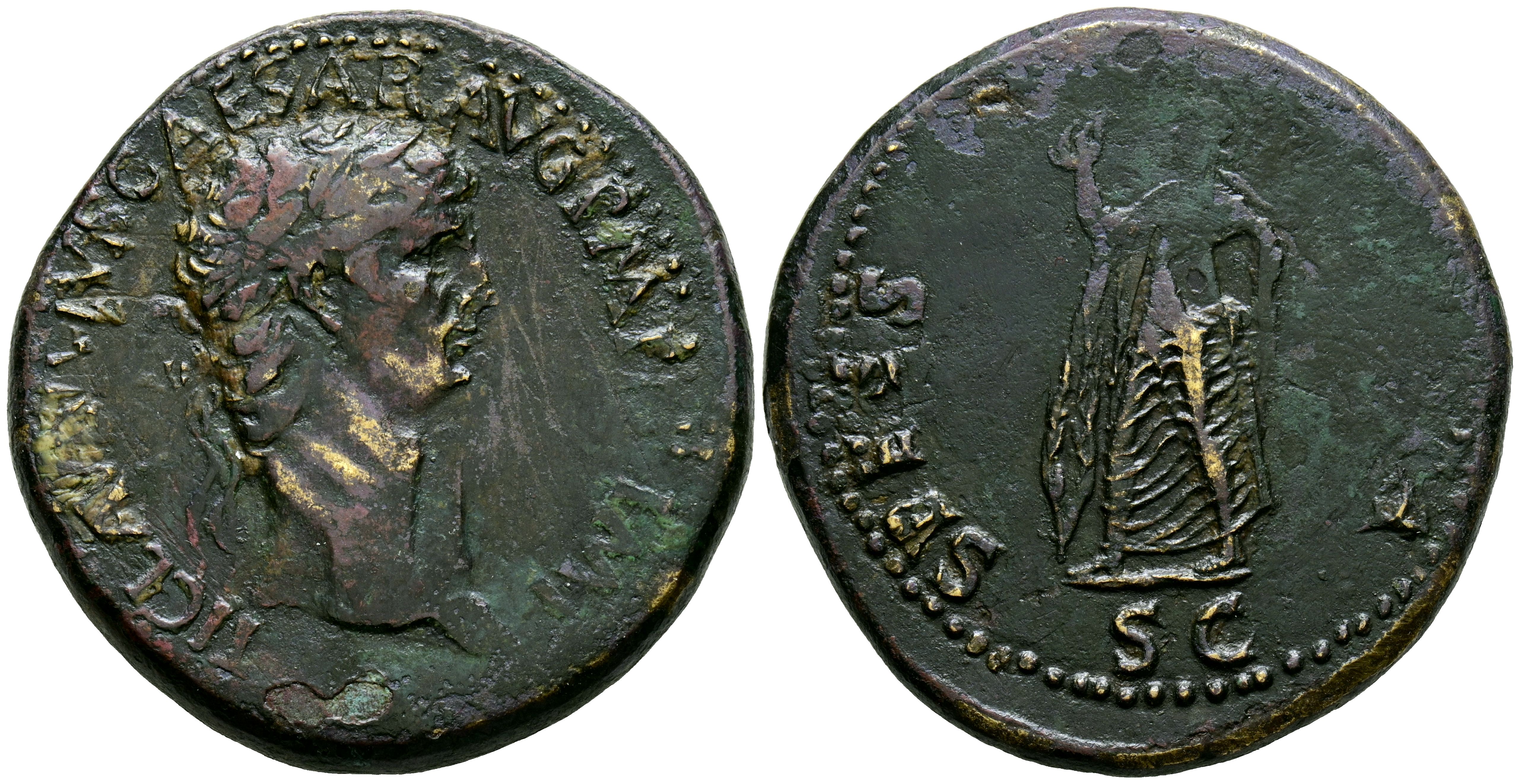 CLAUDIUS I. Sestertius. (Ae. 28.80g/37mm). 42-43 AD Rome. (RIC 99). Anv: Laureate head of Claudius I to the right, around legend: TI CLAVDIVS CAESAR AVG PM TR P IMP. Rev: Spes advancing to the left carrying a flower, below Uncirculated, around legend: SPES AVGVSTA. Very Fine. Cleaned.