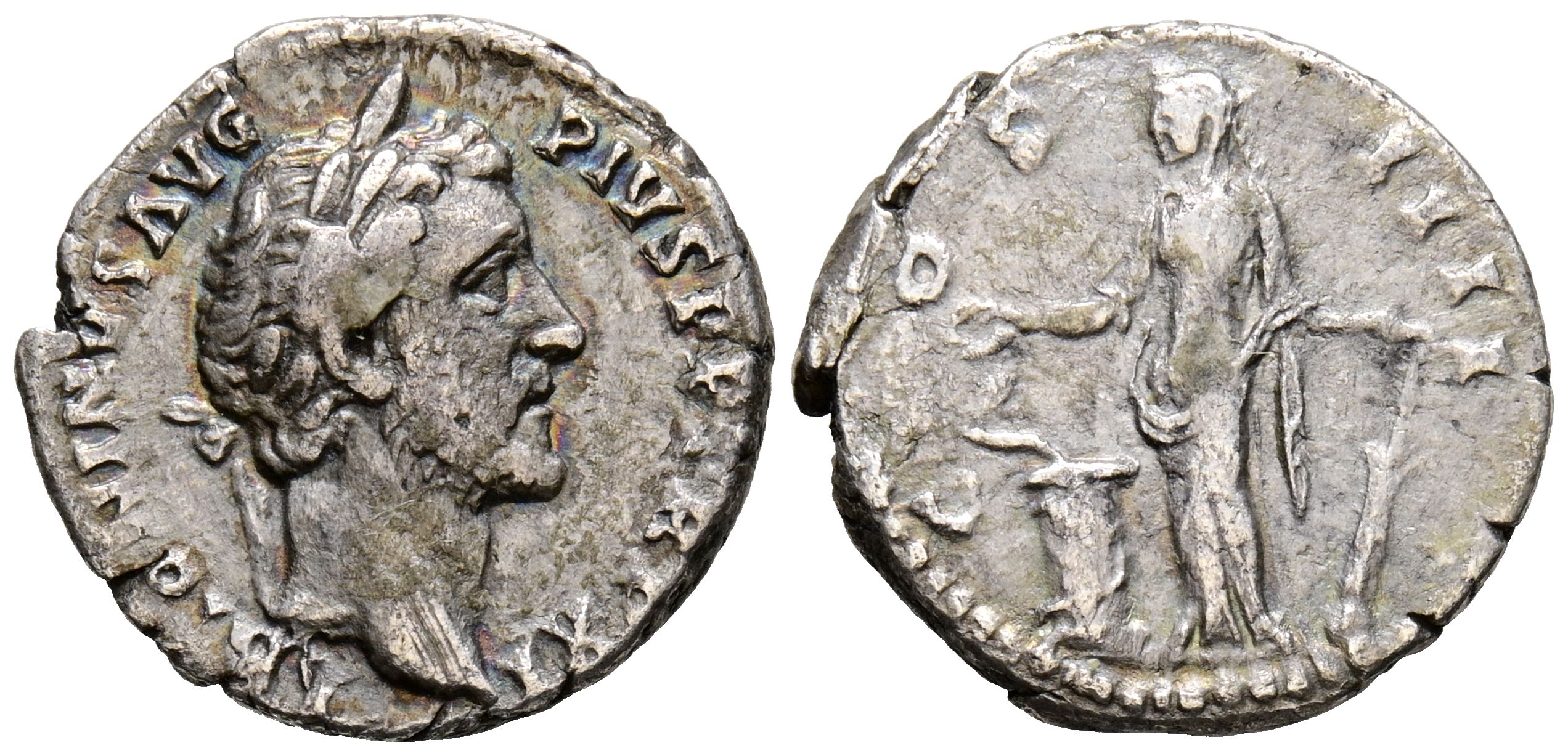 ANTONINO PIO. Denarius. (Ar. 2.59g/17mm). 148-149 AD Rome. (RIC 167). Anv: Laureate head of Antoninus Pius to the right, around legend: ANTONINVS AVG PIVS PP TR P XI. Rev: Salus standing on the left carrying a helm and feeding a boat snake on the altar, around the legend: COS IIII. Very Fine.