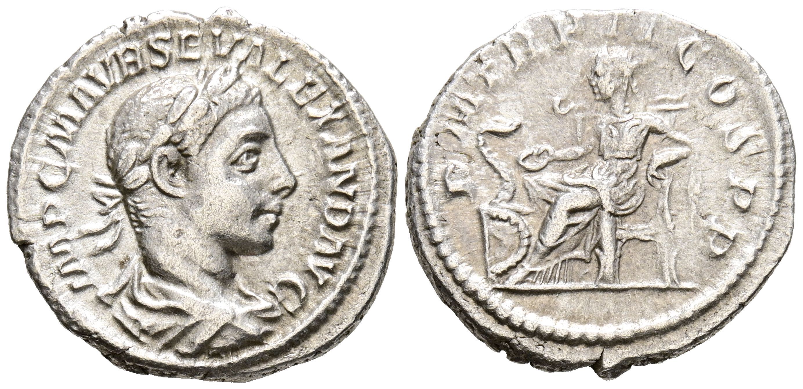 English SEVERUS ALEXANDER. Denarius. (Ar. 2.51g/19mm). 222 AD Rome. (RIC 14). Anv: Laureate and draped bust of Alejandro Severo on the right, around legend: IMP CM AVR SEV ALEXAND AVG. Rev: Salus seated on the left feeding the snake from the boat, around legend: PM TR P COS P P. Very Fine.