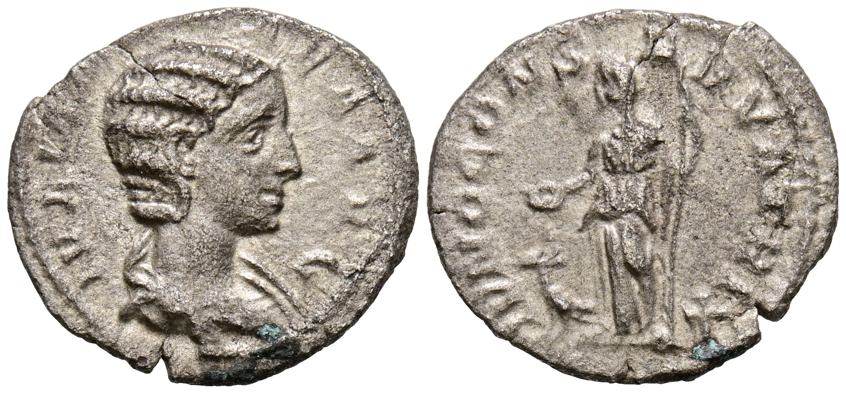 JULIA MAMAEA. Denarius. (Ar. 2.45g/19mm). 222 AD Rome. (RIC 343). Anv: Draped bust of Julia Mamaea to the right, around legend: IVLIA MAMAEA AVG. Rev: Juno standing on the left carrying a patera and scepter, at her feet a real, around the legend: IVNO CONSERVATORIX. Very Fine.