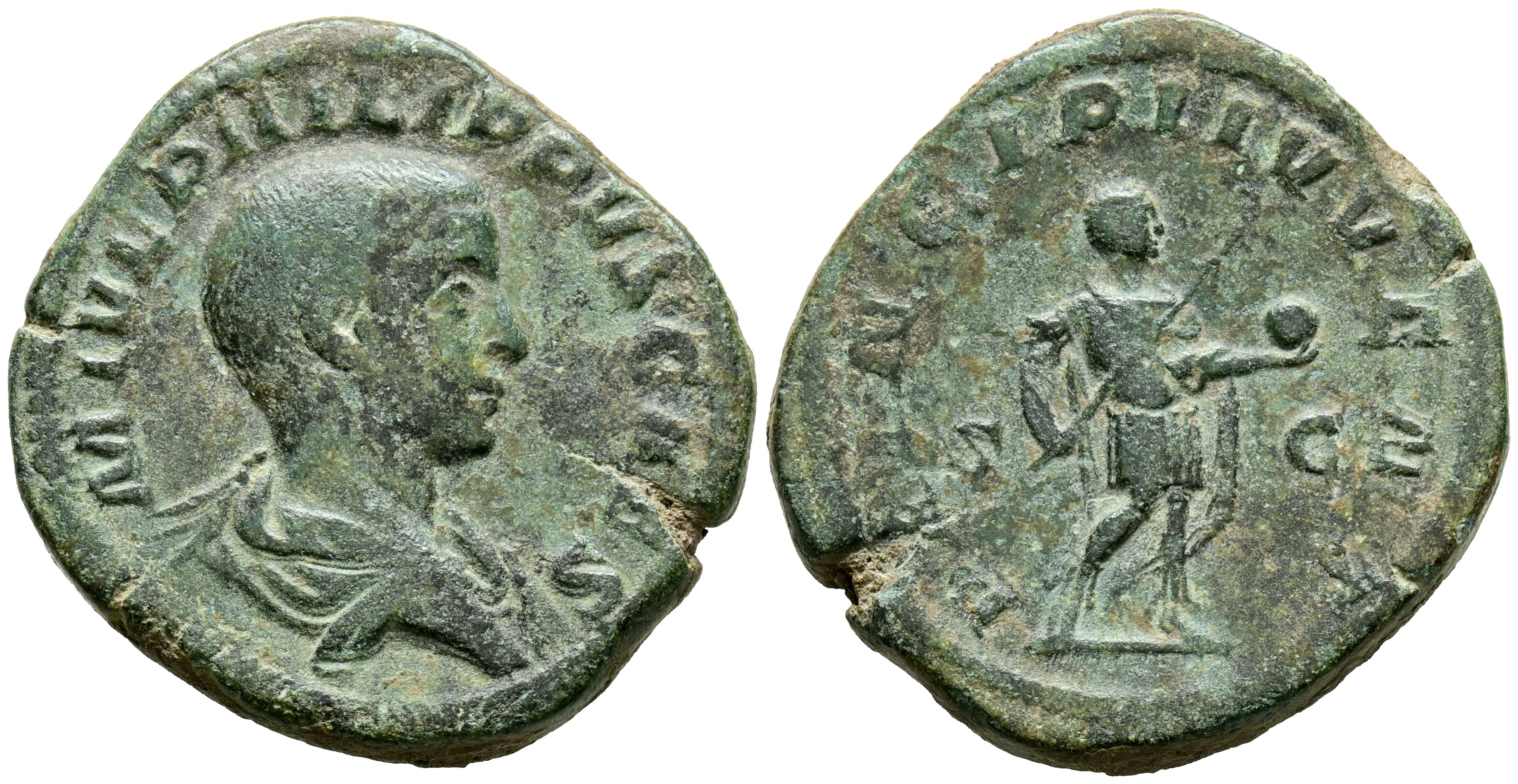 PHILIPPI II. Sesterce. (Ae. 19.62g/32mm). 246-247 AD Rome. (RIC 256a). Anv: Laureate bust of Philip II to the right, around legend: M IVL PHILLIPVS CAES. Rev: Philip II standing on the left carrying a spear and globe, between: Uncirculated, around legend: PRINCIPI IVVENT. Almost Very Fine.