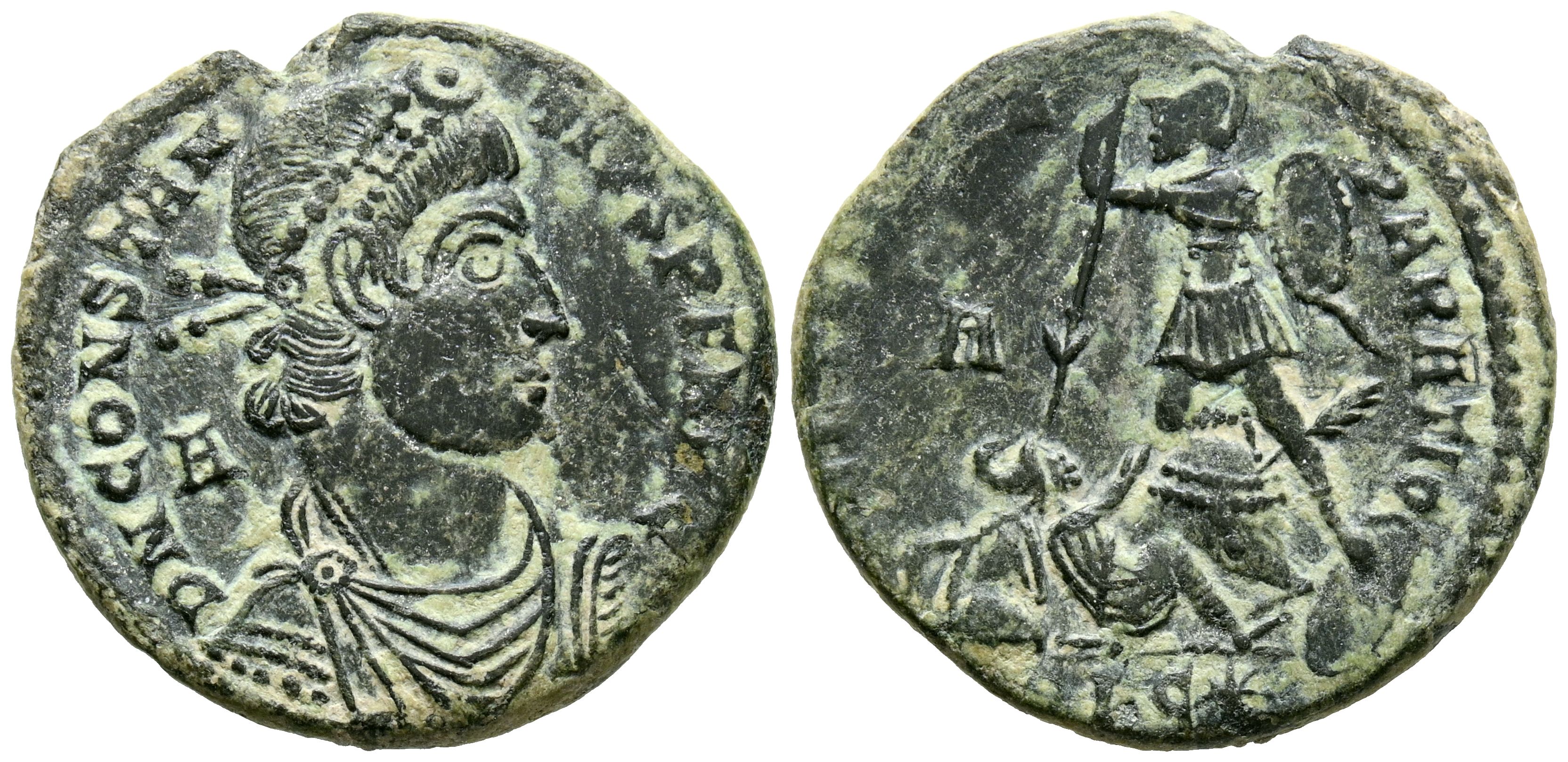 English CONSTANTINE II. Follis. (Ae. 5.51g/23mm). 337-361 AD Mint not visible. Anv: Diademed and draped bust of Constantine II to the right, in field A, around legend: DN CONSTANTINVS PF AVG. Rev: Soldier spearing fallen rider, in field A, around legend: FEL TEMP REPARATIO. Good Very Fine.