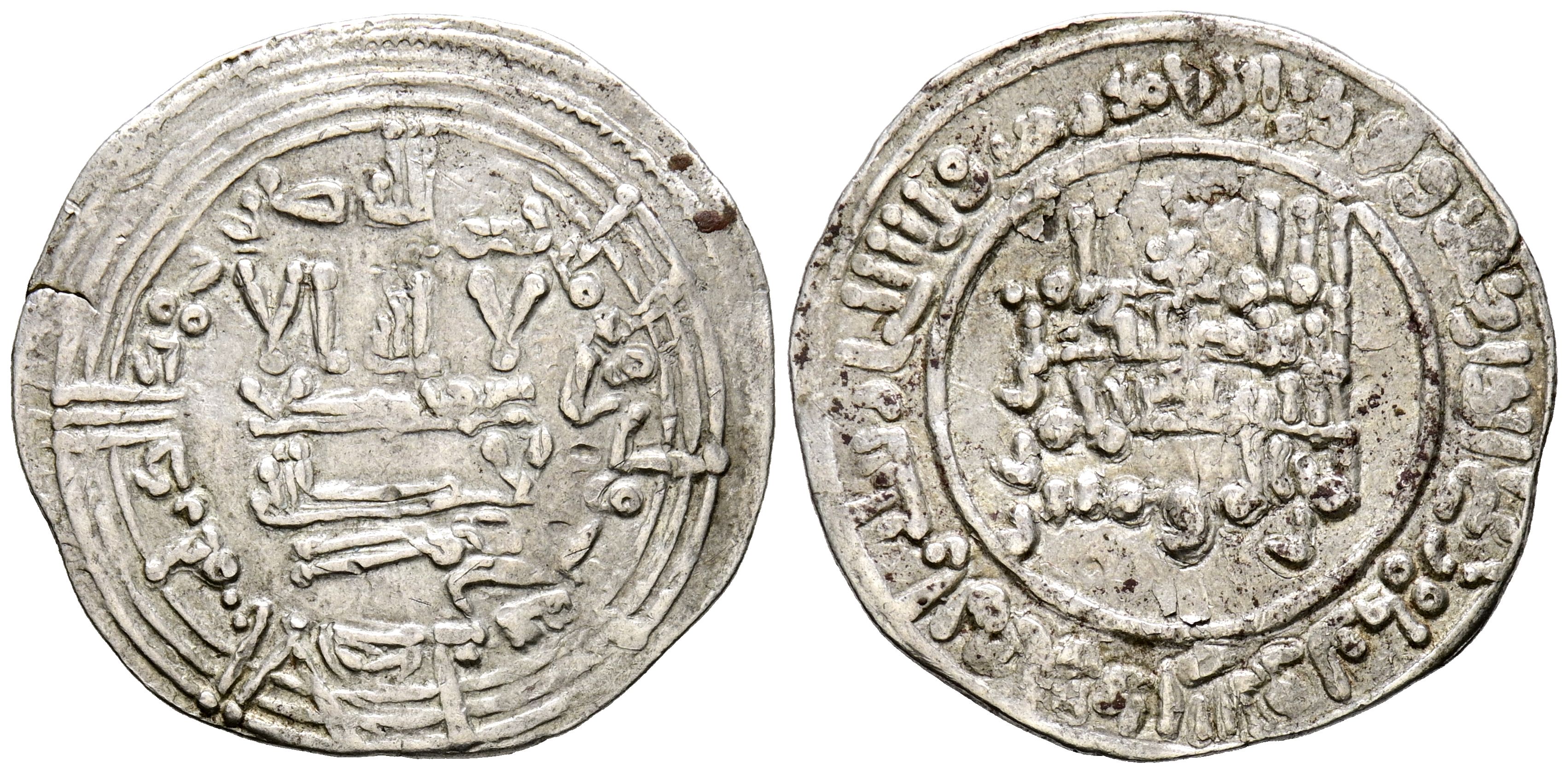 CALIPHATE OF CÓRDOBA. 'Abd al-Rahman III. Dirham. (Ar. 3.25g/24mm). 33(3)H. al-Andalus / الاندلس. (Vives 404; R.Frochoso 2009 333?; Miles 221c). Quoting Muhammad in IA. The piece has an engraving error on the unit, which is reduced to a simple horizontal line. Very Fine. Rare specimen.