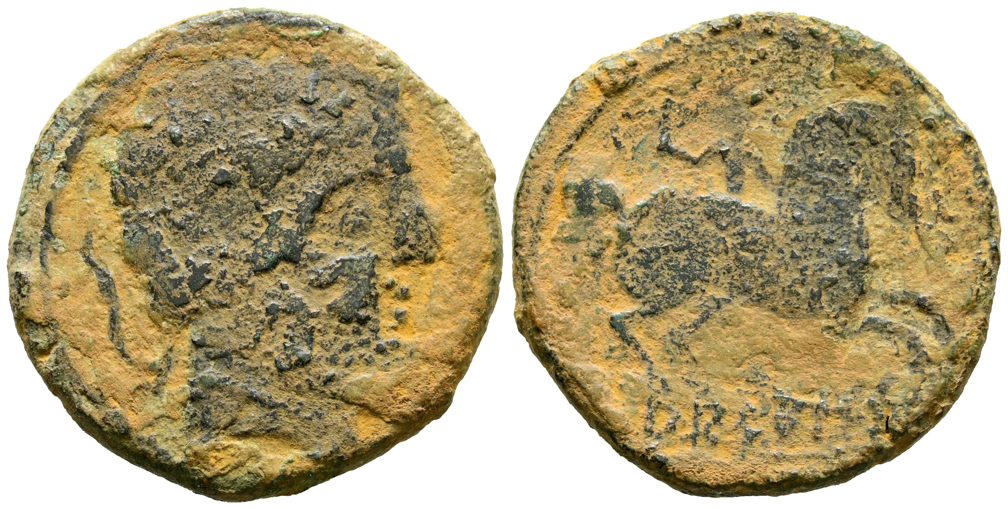 ARSAOS (Navarra Area). As. (Ae. 6.93/24mm). 120-80 BC (FAB-144). Anv: Bearded male head on the right, between two dolphins. Rev: Rider with dart to the right, below Iberian legend: ARSAOS. Almost Very Fine.