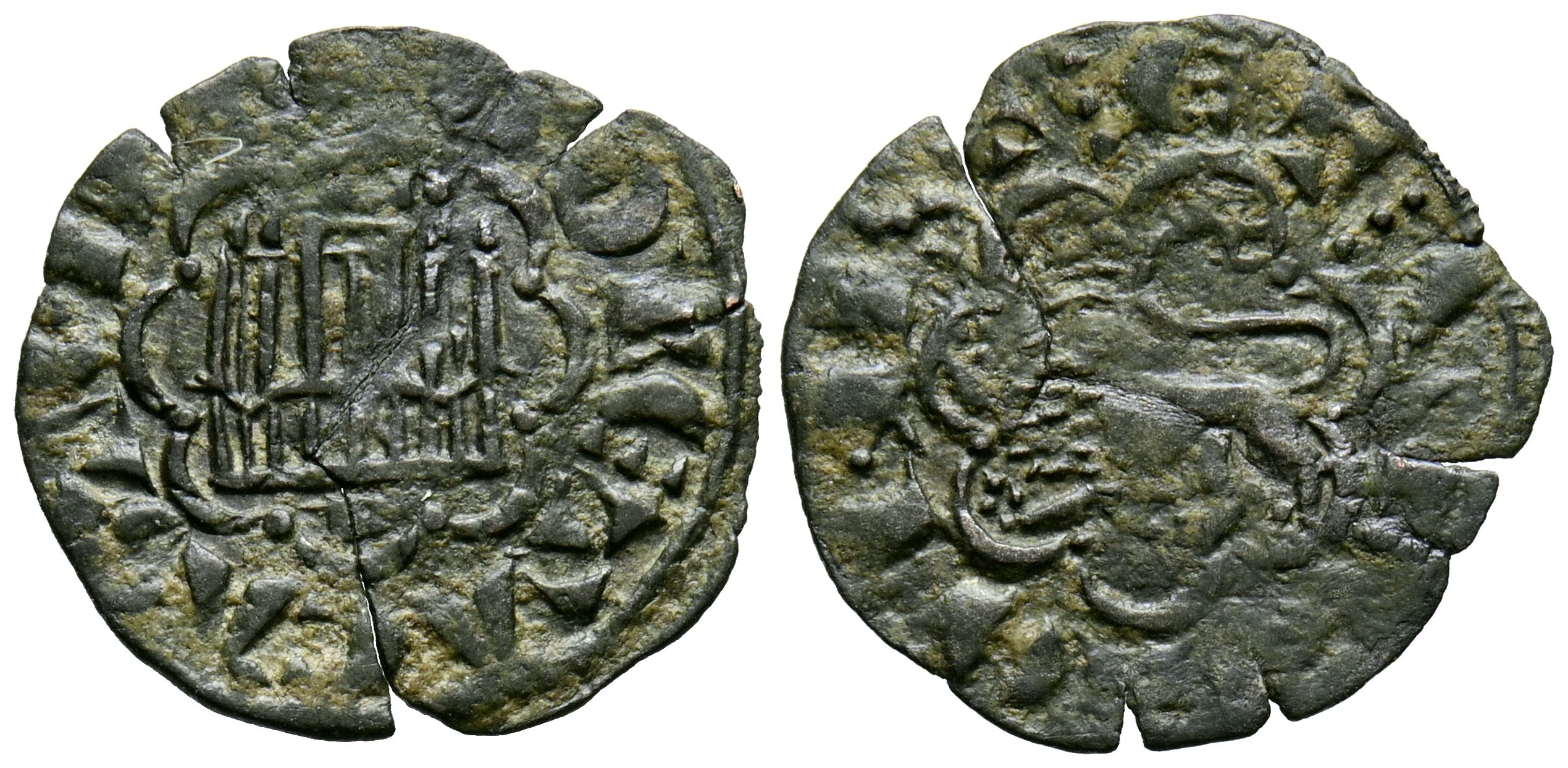 ALFONSO X (1252-1284). "New White" Alfonsí. (Ve. 0.69g/18mm). Toledo. (Imperatrix A10:11.35; FAB-269). Anv: Castillo and below T within lobular graphics, around legend: MONETA CASTELLE. Rev: Rampant lion to the left within lobular graphics, around legend: ET LEGIONIS. Very Fine. Crack. Dark patina.