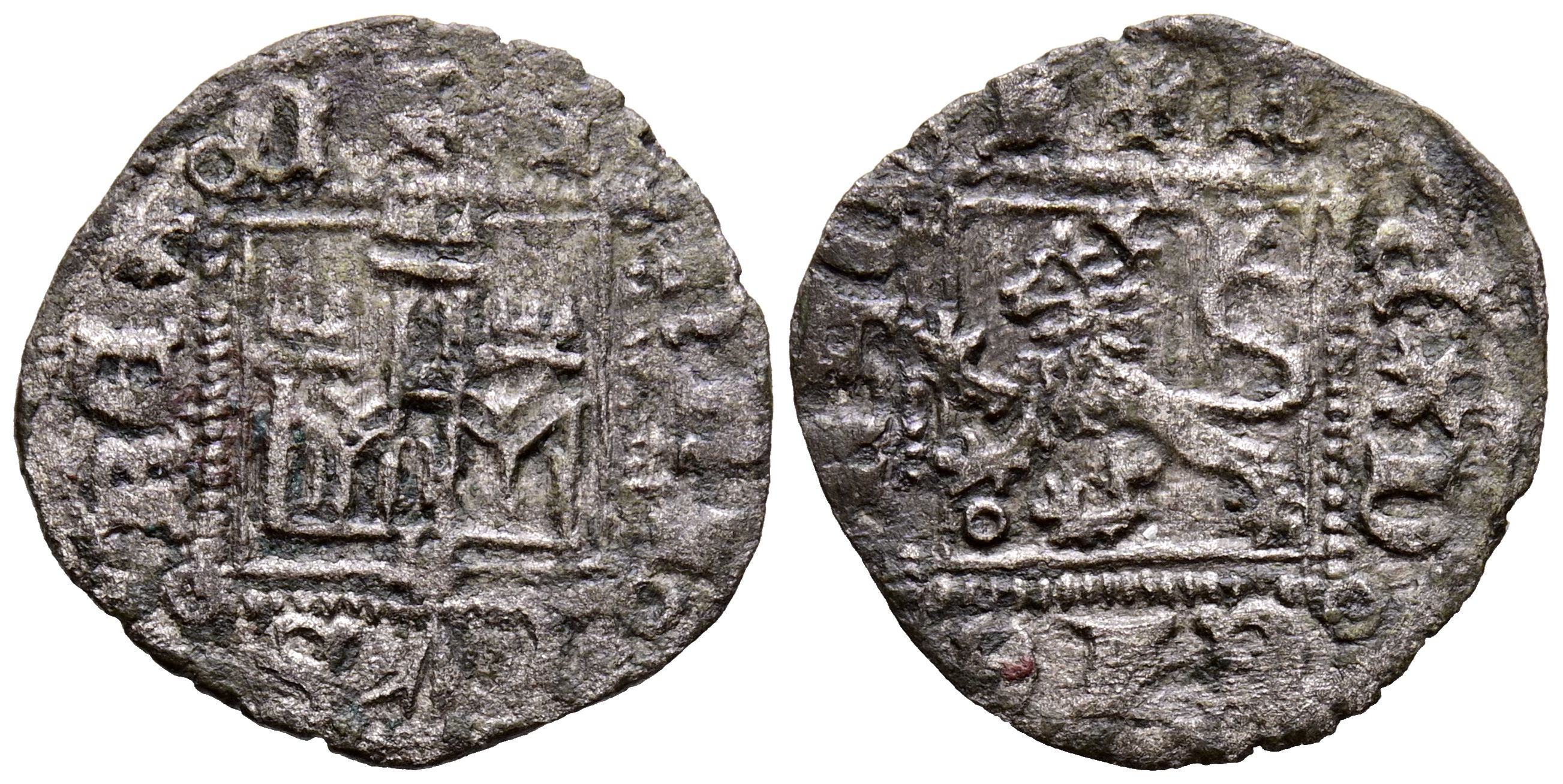 HENRY II (1368-1379). Novén money. (Ve. 0.87g/18mm). Burgos. (Imperatrix E2:31.1; FAB-494). Anv: Castle, below B, all within square graphics, around legend: E NRI CVS REX C. Rev: Rampant lion to left with ring under claws, all within square graphics, around legend: R EXD EIG RAC I. Very Fine.