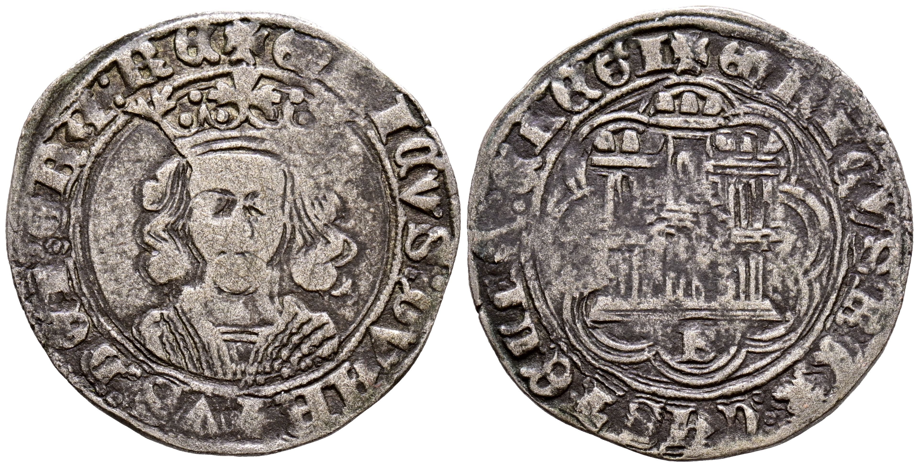 HENRY IV (1454-1474). Cuartillo. (Ve. 3.28g/27mm). Burgos. (Imperatrix E4:14.32; FAB-739). Anv: Bust of Henry IV crowned and facing forward within a circular graphic, around legend: ENRICVS QUARTUS DEI GRA REX. Rev: Castillo, below B, all within a double polylobular graph, around legend: ENRICVS REX CASTELLE E LEGI. Very Fine.