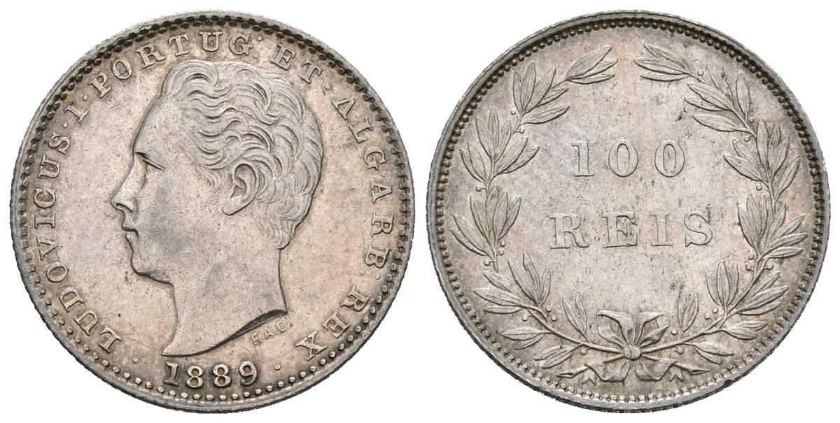 PORTUGAL. Luis I. 100 Reis. 1889. Km#510; Gomes 09.08. Ar. 2,52g. Suave pátina. EBC-.