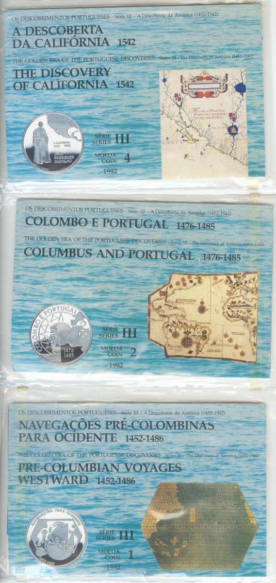 PORTUGAL. Juego de 3 sets de los descubrimientos Portugueses: 200 Escudos 1991 Navegaciones Précolombinas para occidente, 200 Escudos 1992 Colón y Portugal y 200 Escudos 1992 Descubrimiento de California. Ar. SC.