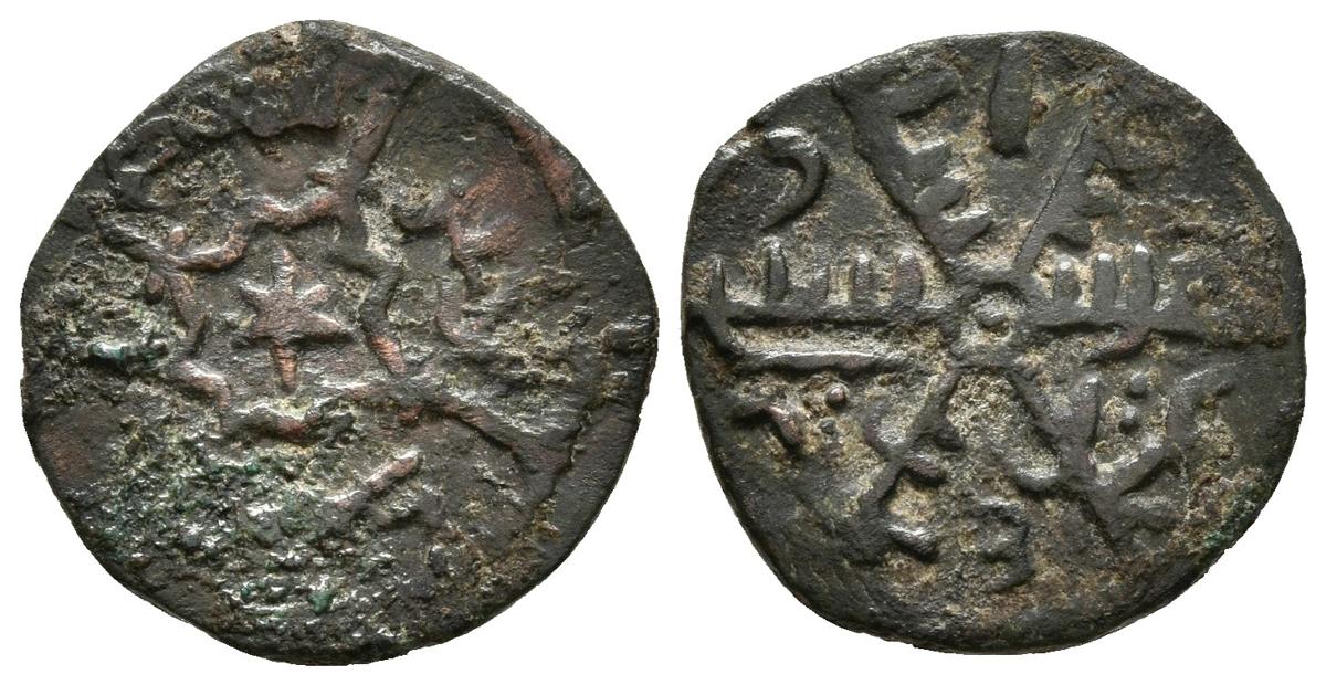 SICILIA. Ruggero II. 1/2 Follaro. (1105-1154). Messina. A/ Estrella centrar con cuatro radios, dentro leyenda cúfica. R/ Leyenda cúfica en seis radios entorno a un punto central. Spahr 79. Ae. 1,44g. MBC-/MBC.