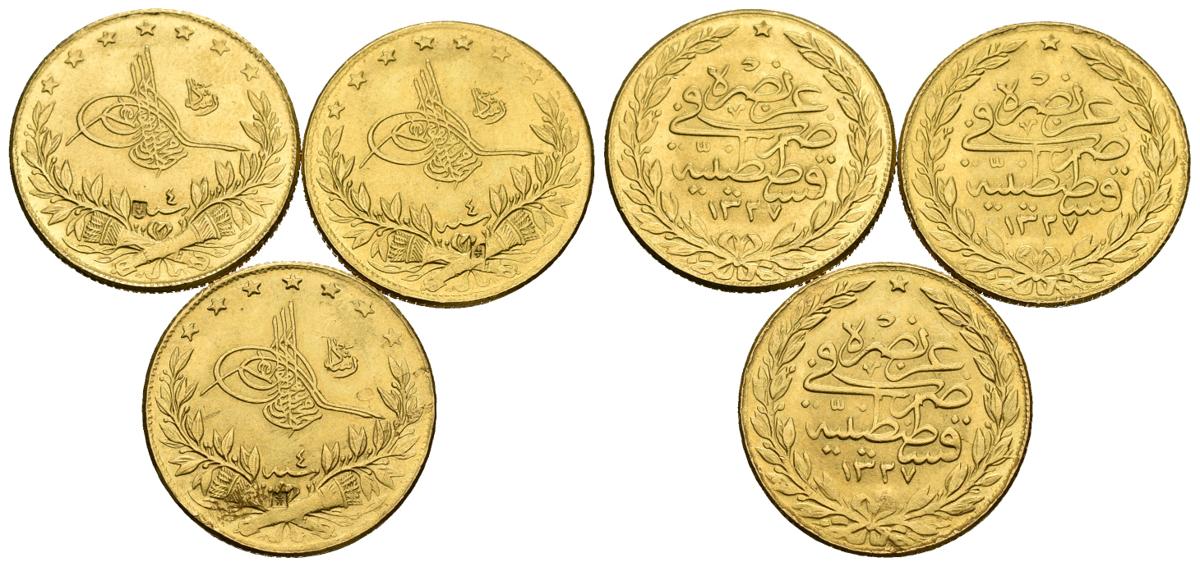 TURQUIA. Lote compuesto por 3 monedas de Mehmed V. 100 Kurush. 1327H. Constantinopla. Km#754. Au. 7,23g. Copias de joyería de magnífica claidad. MBC+/EBC-.