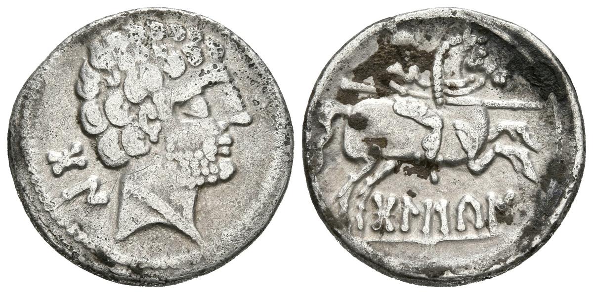 BOLSCAN. Denario. 180-20 a.C. Huesca. A/ Cabeza barbada a derecha, detrás letras ibéricas BoN. R/ Jinete con lanza a derecha, debajo leyenda ibérica. FAB-1911. Ar. 3,93g. Depósitos en rev. MBC-/MBC+.