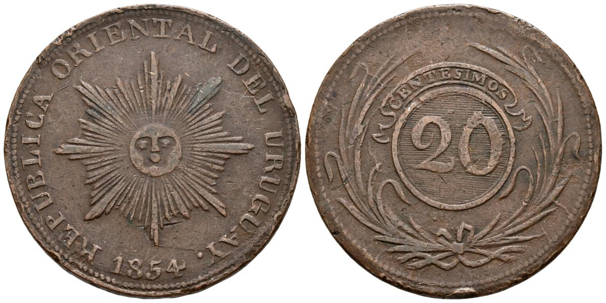 URUGUAY. 20 Centésimos. 1854. Km#7. Ae. 21,21g. MBC+.