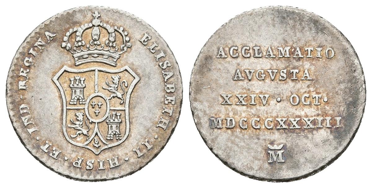ISABEL II. Medalla de proclamación. 1833. Madrid. ACCLAMATIO AVGVSTA XXIV · OCT· MDCCCXXXIII. Ar. 1,53g. 15mm (Módulo de 1/2 Real). Restos del brillo original y bonito tono. EBC/MBC+.