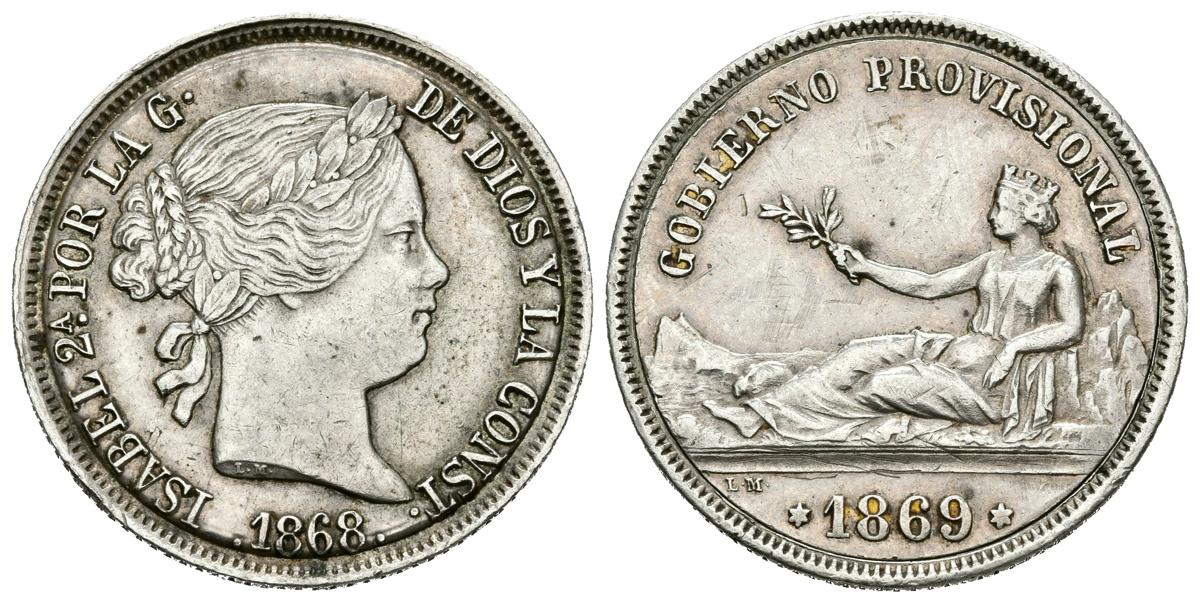 ISABEL II y GOBIERNO PROVISIONAL. Curiosa composición usando un 4 Reales de 1868 y añadiéndole el anverso de 1 Peseta 1869. Ar. 4,42g. MBC+.