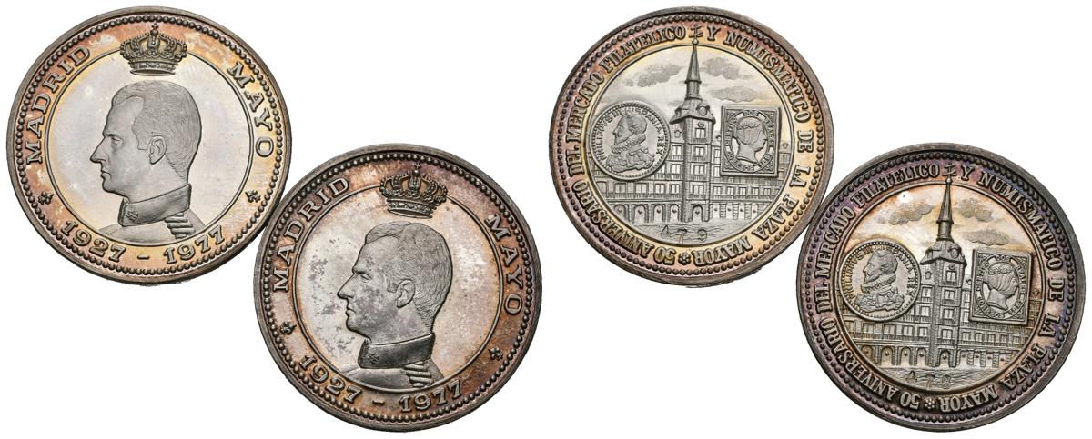 50 ANIVERSARIO DEL MERCADO NUMISMATICO Y FILATELICO DE LA PLAZA MAYOR. Medalla. 1927-1977. Madrid. Tirada de 1000 medallas numeradas. Ar. 35mm. Presentadas en estuche oficial con certificado. (2 Unidades). PROOF.