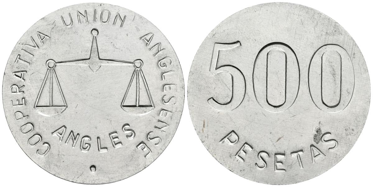 COOPERATIVA UNION ANGLESENSE. 500 Pesetas. Anglés. Prueba en Aluminio. L-2206. Al. 10,28g. SC-. Muy rara.