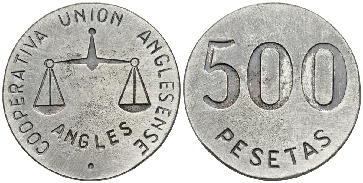 COOPERATIVA UNION ANGLESENSE. 500 Pesetas. Anglés. Prueba en cobre con baño de plateado. L-2205. Cu. 25,71g. Frotada. MBC+. Muy rara.