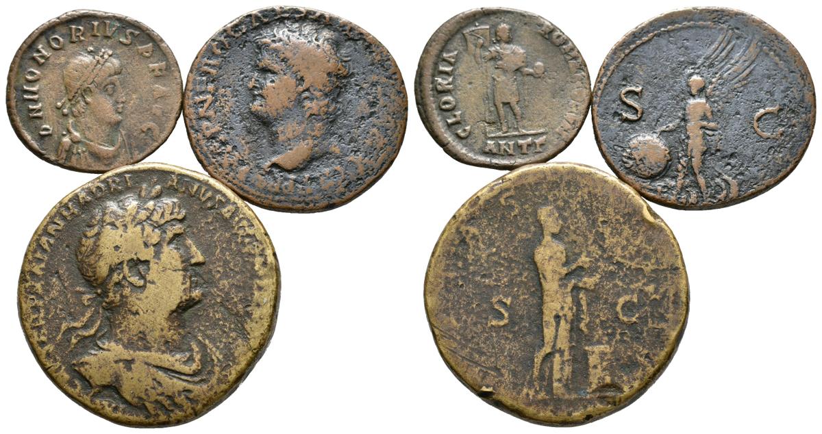 IMPERIO ROMANO. Lote compuesto por 3 monedas de bronce, conteniendo: As de Nerón (RIC I 144); Sestercio de Adriano (RIC 587b) y Maiorina de Honorio, Antioquía (RIC 68e). Ae. BC+/MBC-. A EXAMINAR.