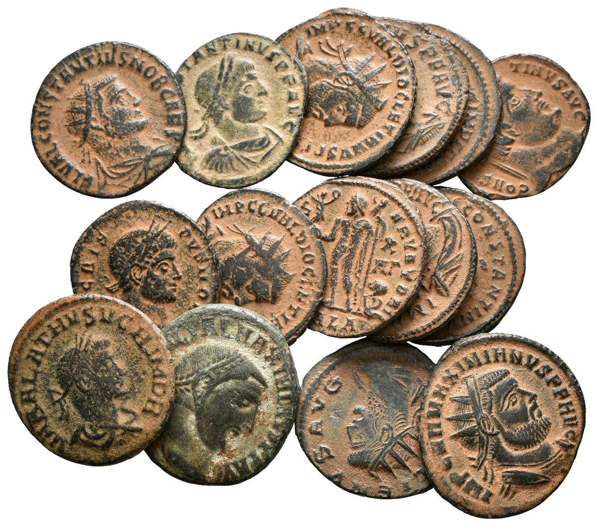 IMPERIO ROMANO. Lote compuesto por 15 bronces del bajo imperio, incluyendo diferentes emperadores como Constantino, Diocleciano, Maximiano, Aureliano y Vabalato, Galieno, Crispo, Constancio, Probo, Constantino II y Licinio. Pátinas tipo desierto. Ae. MBC/EBC-. A EXAMINAR.