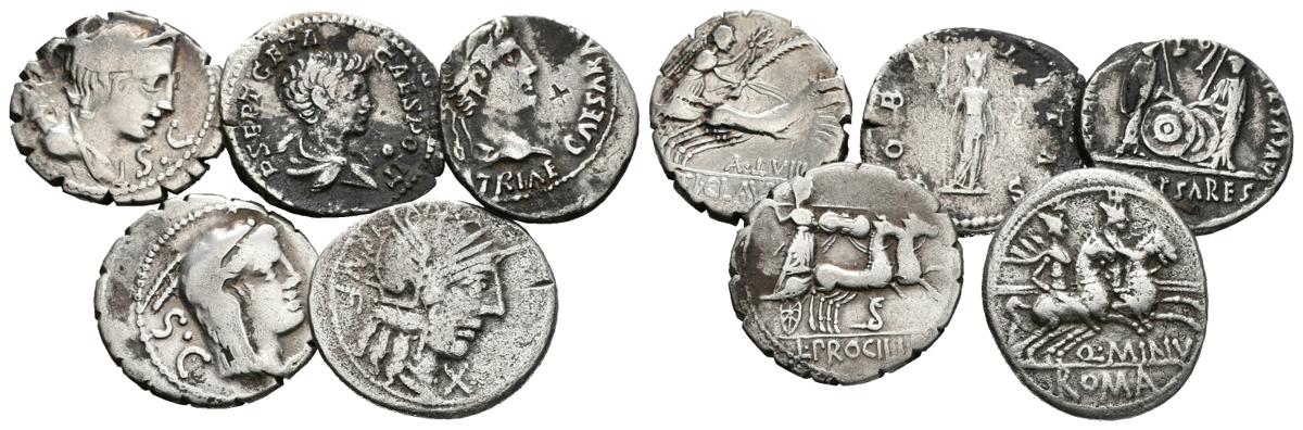 REPUBLICA e IMPERIO ROMANO. Lote compuesto por 5 denarios, contentiendo: TI. CLAUDIUS NERO. 79 a.C. Roma; L. PROCILIUS. 80 a.C. Roma; Q. MINUCIUS RUFUS. 122 a.C. Roma; AUGUSTO. 27 a.C.-14 d.C. Lugdunum y GETA. 200-202 d.C. Roma. Ar. BC/MBC-. A EXAMINAR.