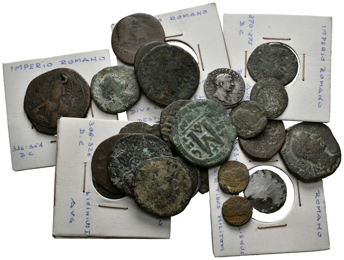 IMPERIO ROMANO y BIZANTINO. Lote compuesto por 29 monedas, contiene diferentes tipos: As, Sestercio, Denario, Follis, etcétera, de diferentes emperadores como: Augusto, Domiciano, Trajano, Treboniano Galo, Constantino, Magnencio, Claudio II, Licinio I, Diocleciano, Galieno y diversos follis bizantinos. A EXAMINAR.