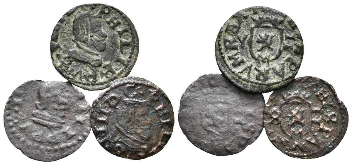 FELIPE IV. Lote compuesto por 3 monedas de 2 Maravedís. (1663). Madrid YS y 1663. Trujillo M. Ae. BC+/MBC+. A EXAMINAR.