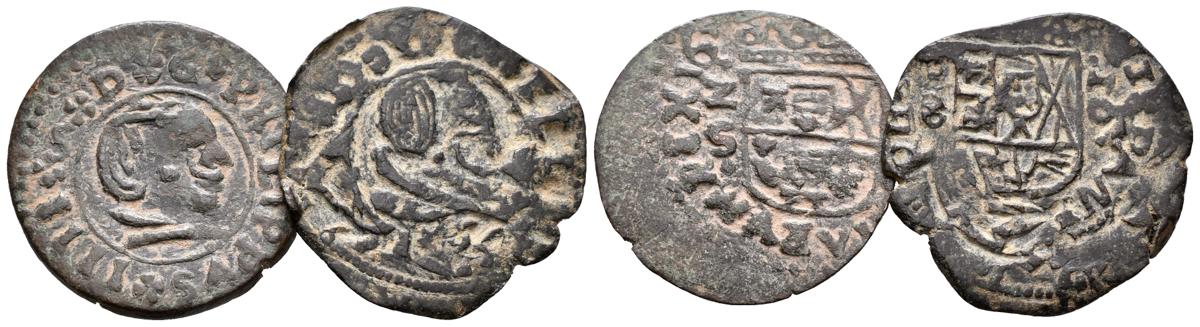 FELIPE IV. Lote compuesto por 2 monedas de 16 Maravedís Falsas de época de Madrid con N tumbada en lugar de M y ¿Madrid M-S? esta resellada a ¿VI? maravedís 1641. Cal-No cita; J.S. M No cita. Ae. MBC.