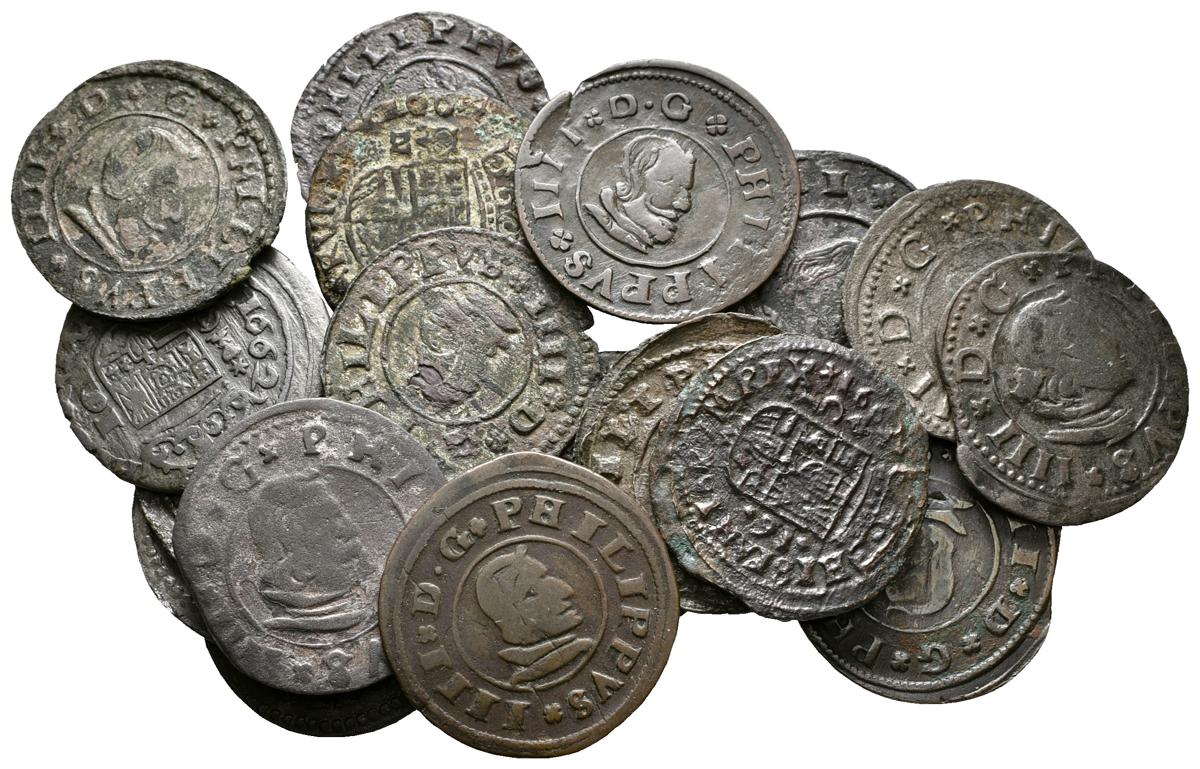 FELIPE IV. Lote compuesto por 19 monedas de 16 Maravedís. Conteniendo: 1663. Cordoba TM; 1662. Coruña R; 1662. Cuenca CA; 1663. Cuenca CA; 1662. Granada N; 1663. Granada N; 1664. Granada N; 1661. Madrid Y; 1662. Madrid S; 1663. Madrid Y; 1664. Madrid Y; 1661. Segovia S (2); 1662. Sevilla R; 1663. Sevilla R; 1661. Trujillo M; 1664. Valladolid M (3). Ae. MBC-/MBC+. A EXAMINAR.