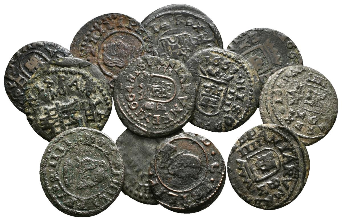 FELIPE IV. Lote compuesto por 12 monedas de 4 Maravedís. Conteniendo: 1664. Burgos R; 1663. Cuenca CA; 1663. Coruña R; 1661. Madrid T; 1663. Madrid MY; 1664. Madrid S; 1664. Segovia; 1663. Sevilla R (2) y 1663. Trujillo M. Ae. MBC-/MBC+. A EXAMINAR.
