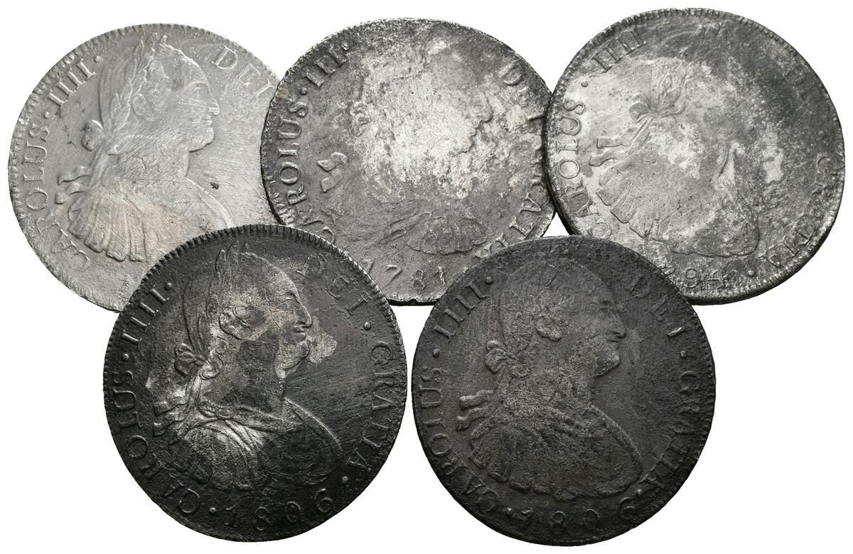 CARLOS III y CARLOS IV. Lote compuesto por 5 monedas de 8 Reales: 1781 Lima MI, 1794 Potosí PR, 1806 Guatemala M (2) y 1807 México TH. Todas con oxidaciones marinas. Ar. BC+/MBC-. A EXAMINAR.