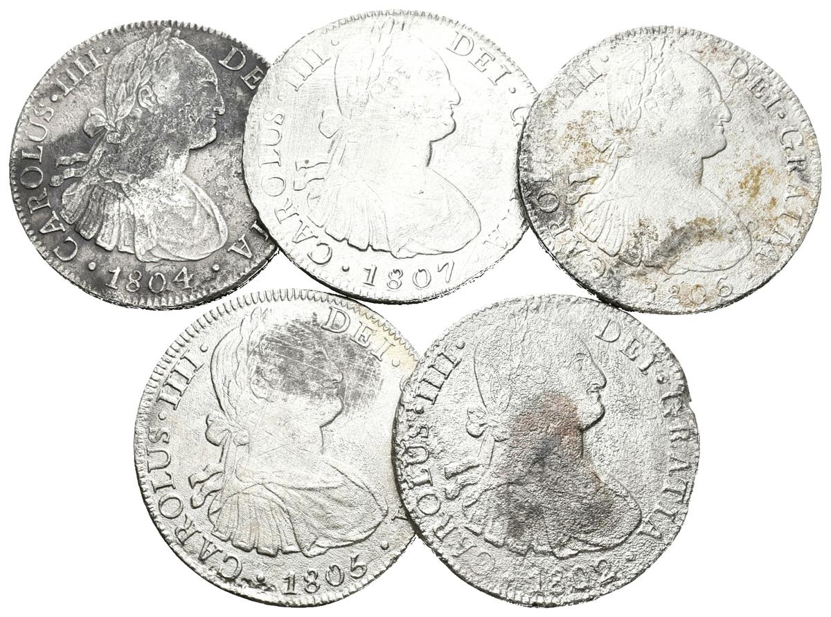 CARLOS IV. Lote compuesto por 5 monedas de 8 Reales de México. 1802 FT Cal-698, 1804 TH Cal-701, 1805 TH Cal-703, 1806 TH Cal-705 y 1807 TH Cal-707. Todos con oxidaciones marinas. Ar. BC+/MBC-. A EXAMINAR.