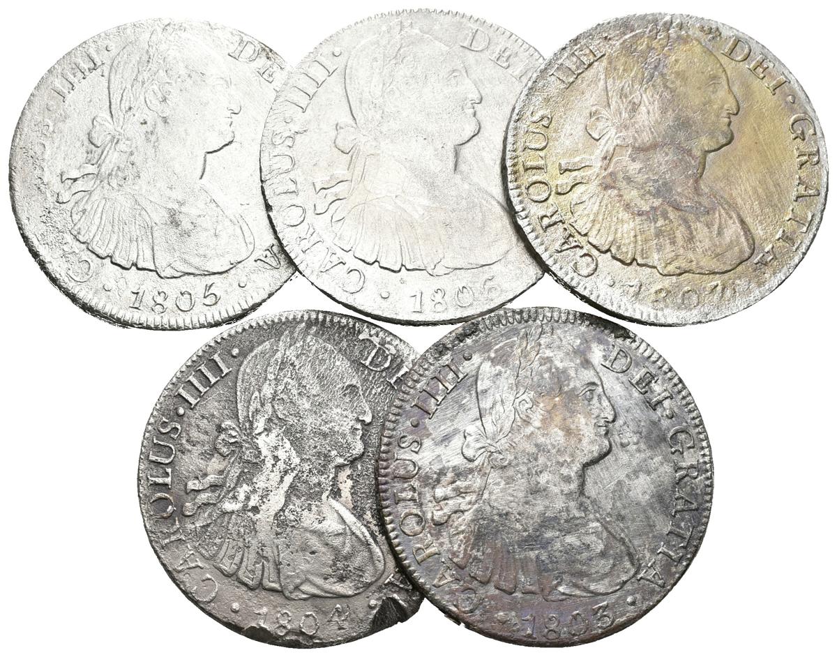 CARLOS IV. Lote compuesto por 5 monedas de 8 Reales de México. 1803 FT Cal-700, 1804 TH Cal-701, 1805 TH Cal-703, 1806 TH Cal-705 y 1807 TH Cal-707. Todos con oxidaciones marinas. Ar. BC+/MBC-. A EXAMINAR.