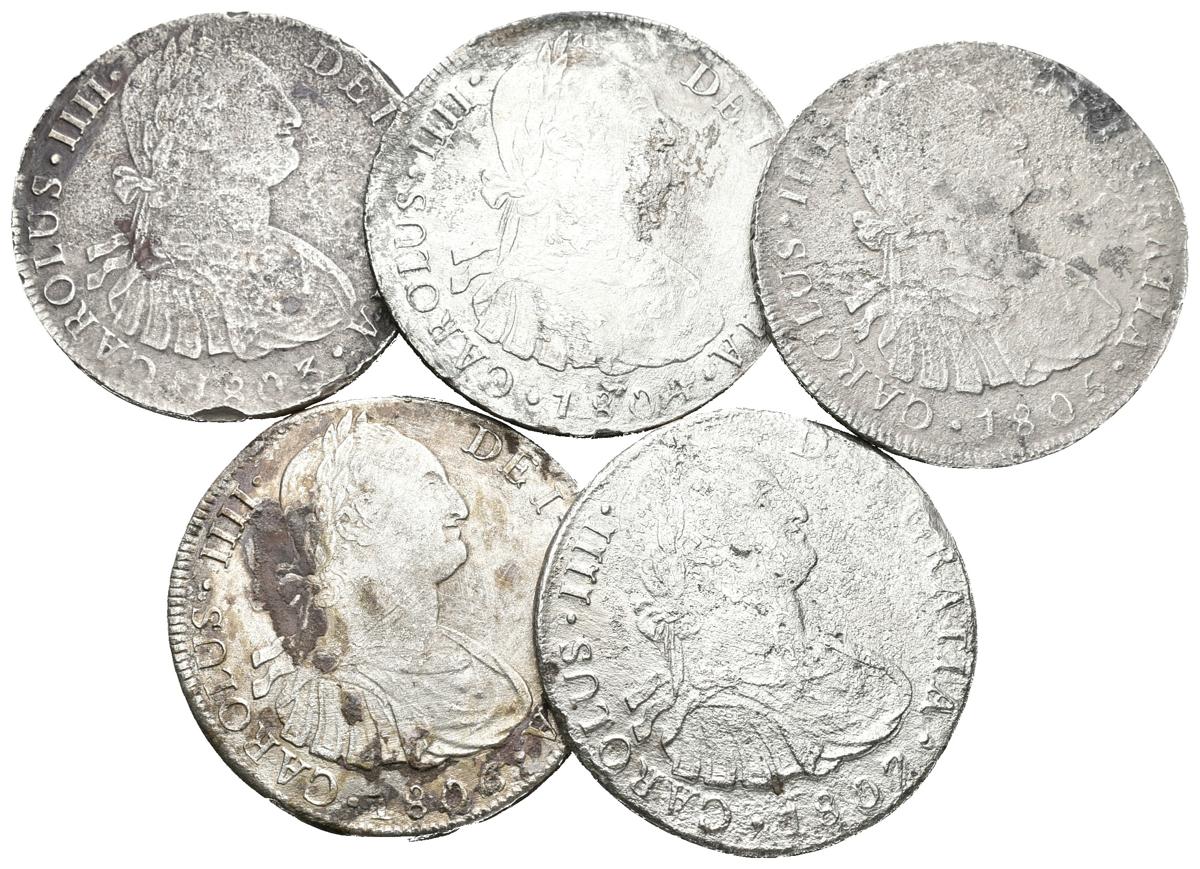 CARLOS IV. Lote compuesto por 5 monedas de 8 Reales de Lima. 1803 IJ Cal-659, 1804 JP Cal-661; 1805 JP Cal-662, 1806 JP Cal-663 y 1807 JP Cal-664. Todos con oxidaciones marinas. Ar. BC+/MBC-. A EXAMINAR.