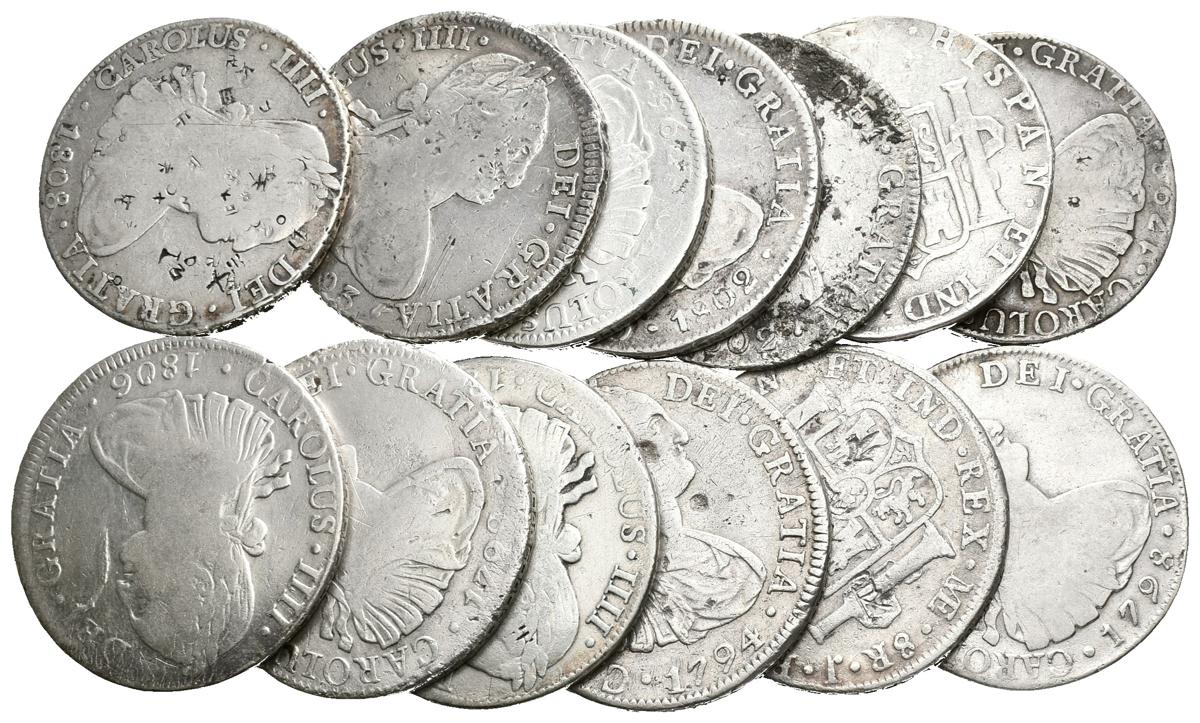 CARLOS IV. Lote compuesto por 13 monedas de 8 Reales, conteniendo: Lima 1798 JJ (2) y 1806 JP; México 1794 FM, 1795 FM, 1799 FM, 1802 FT (2), 1803 FT, 1805 TH y 1806 TH; Potosí 1808 PJ (2). Algunas con resellos chinos. Ar. BC+/MBC-. A EXAMINAR.