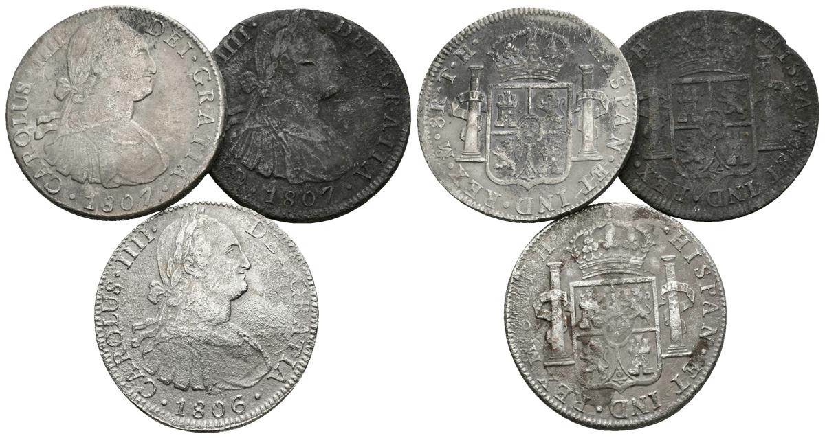 CARLOS IV. Lote compuesto por 3 monedas de 8 Reales de México: 1806 TH y 1807 TH (2). Oxidaciones marinas. Ar. BC+/MBC-. A EXAMINAR.