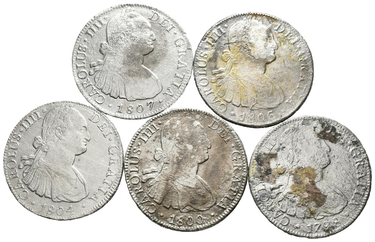 CARLOS IV. Lote compuesto por 5 monedas de 8 Reales de México. 1798 FM Cal-692, 1800 FM Cal-695; 1804 TH Cal-701, 1806 TH Cal-705 y 1807 TH Cal-707. Todos con oxidaciones marinas. Ar. BC+/MBC-. A EXAMINAR.