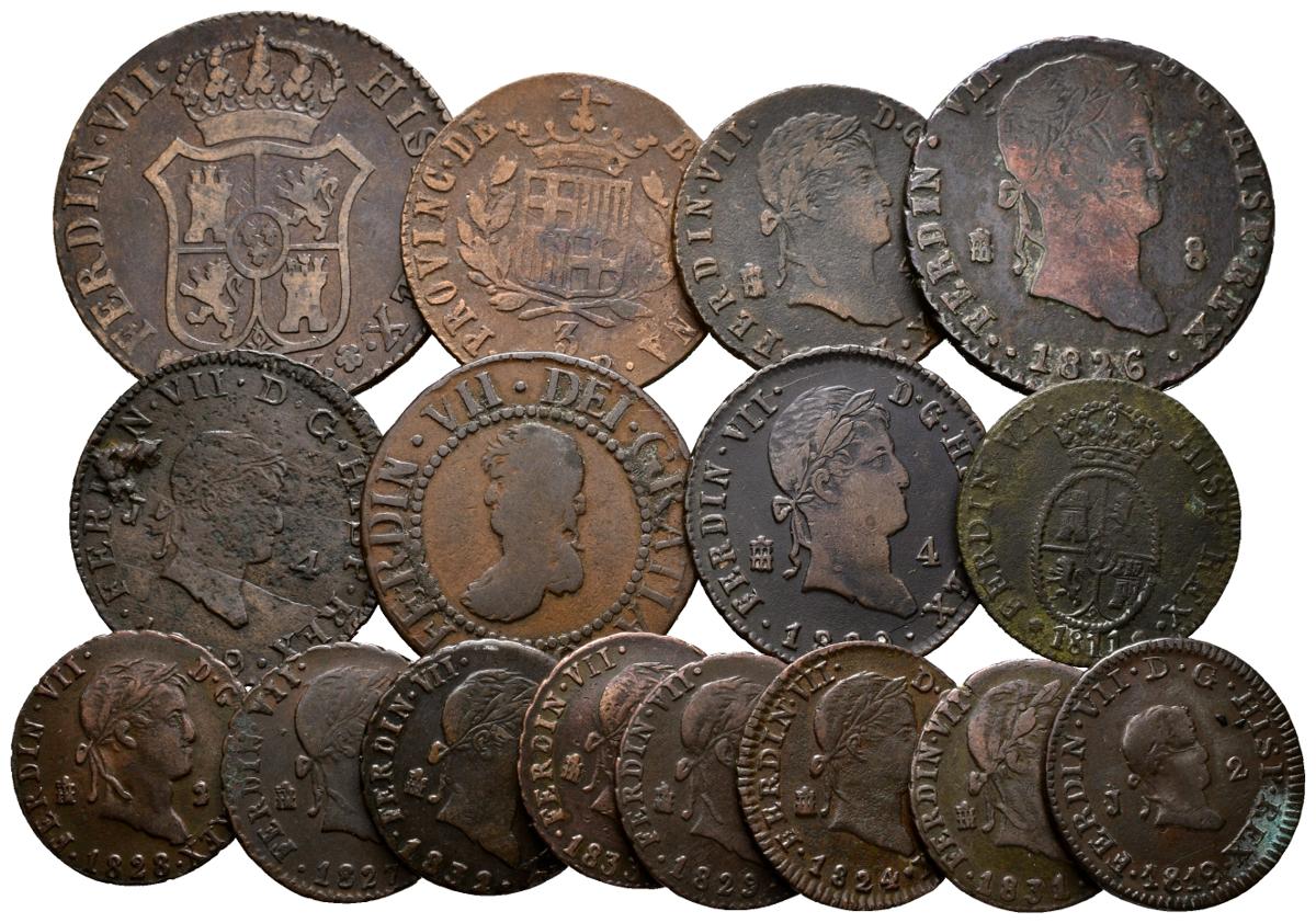 FERNANDO VII. Lote compuesto por 16 monedas de cobre, conteniendo: 2 Maravedís Segovia 1824, 1827, 1828, 1829, 1831, 1832 y 1833, Jubia 1819; 4 Maravedís Segovia 1829 y 1833, Jubia 1819; 8 Maravedís Segovia 1826; 12 Dineros 1812 Mallorca; Cuarto y Medio. 1811 Cataluña, 3 Cuartos. 1823 Cataluña y 6 Cuartos. 1814 Cataluña. Ae. BC+/MBC+. A EXAMINAR.