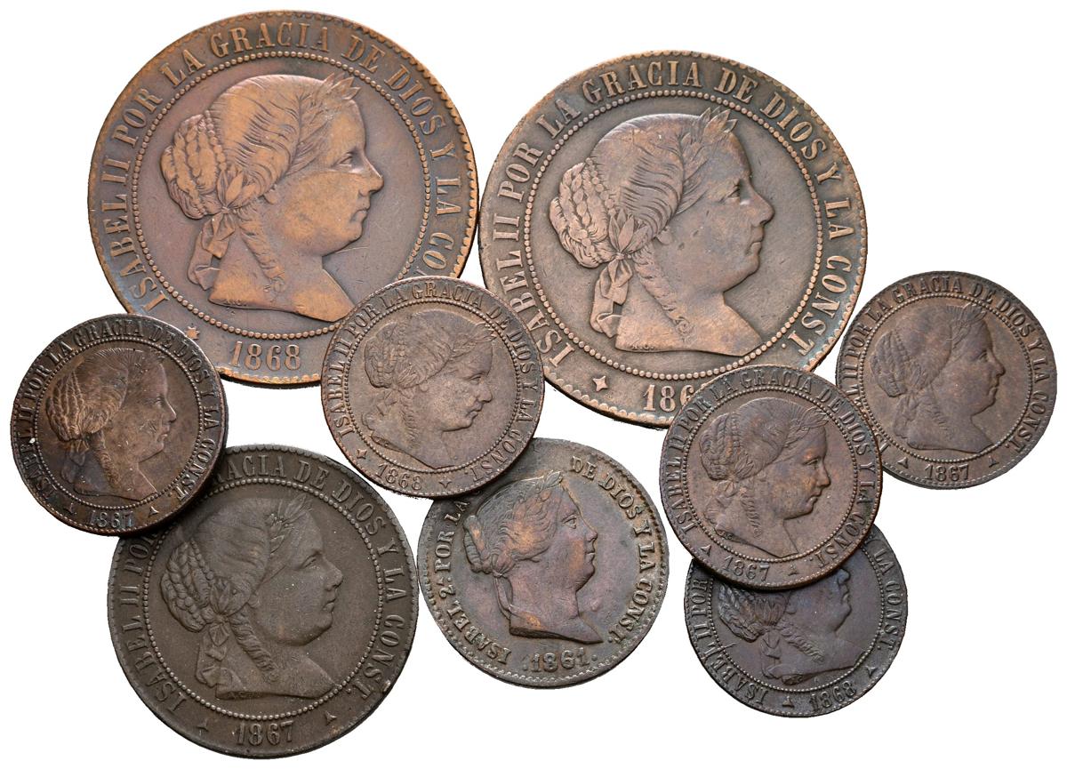 ISABEL II. Lote compuesto por 9 monedas de cobre, conteniendo: 1 Céntimo de Escudo 1868 Jubia, 1867 (3) y 1868 Segovia; 10 Céntimos de Real 1861 Segovia; 2 1/2 Céntimos de Escudo 1867 Segovia; 5 Céntimos de Escudo 1868 Jubia y Sevilla. Ae. MBC-/EBC. A EXAMINAR.