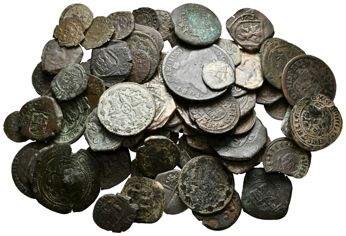 MONARQUIA ESPAÑOLA. Magnífico conjunto de 90 monedas de cobre de los Reyes Católicos, Austrias y Borbones. Gran cantidad de valores, cecas y fechas. Incluye 2 Reales de plata. Ae/Ar. A EXAMINAR.
