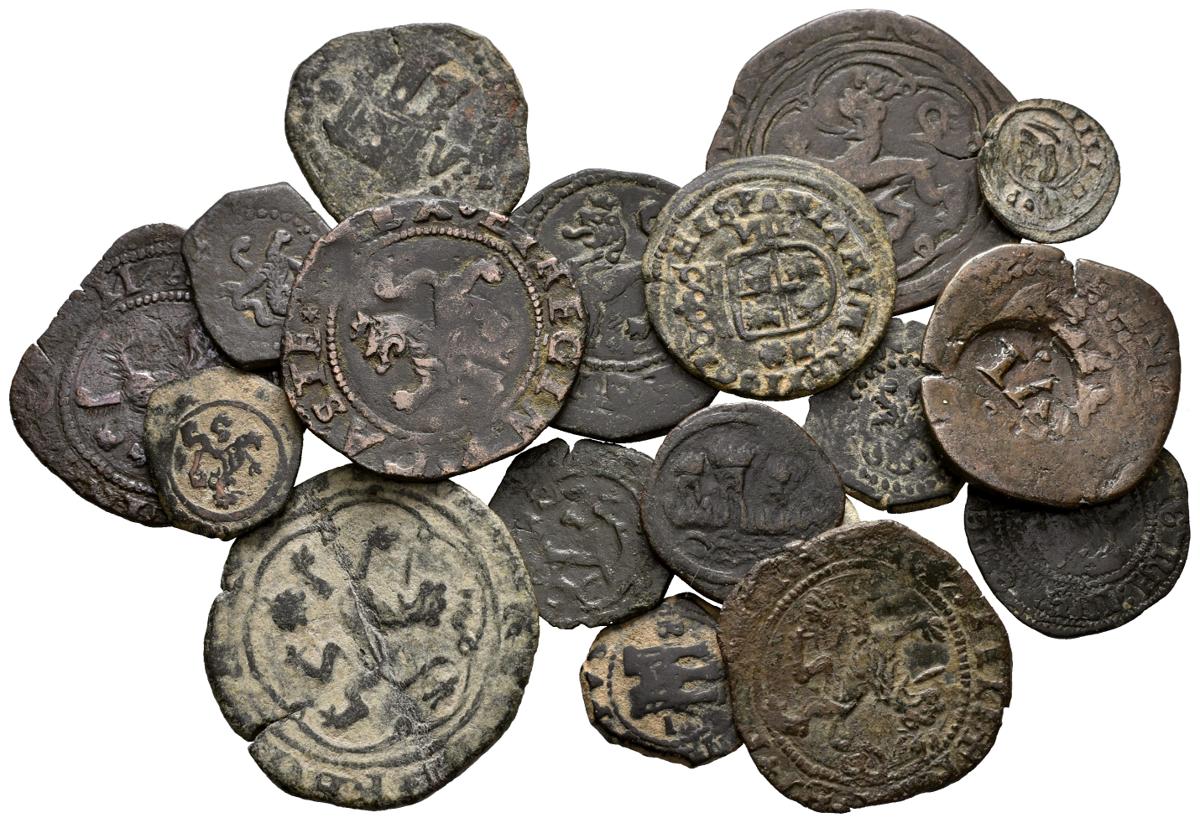 MONARQUIA ESPAÑOLA. Lote compuesto por 18 monedas de cobre. Conteniendo monedas de Reyes Católicos, Felipe II y Felipe IV de diferentes cecas: Burgos, Coruña, Cuenca y Sevilla. (Incluye ceitil de Portugal). Algunas escasas. Ae. BC/MBC+. A EXAMINAR.