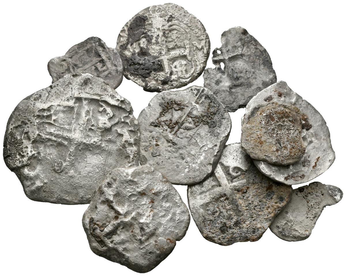 MONARQUIA ESPAÑOLA. Lote compuesto por 10 monedas de plata macuquinas de Felipe V: 1 Real (4), 2 Reales (4), 4 Reales y 8 Reales a clasificar. Oxidaciones marinas. A EXAMINAR.