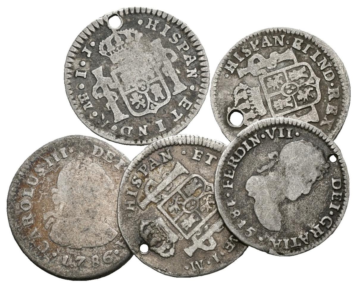 MONARQUIA ESPAÑOLA. Lote compuesto por 5 monedas de 1/2 Real, conteniendo: Carlos III 1773 Lima JM, 1774 Potosí JR, 1786 Lima MI, 1791 Lima IJ y Fernando VII 1815 Lima JP. Varios con perforaciones. A EXAMINAR.