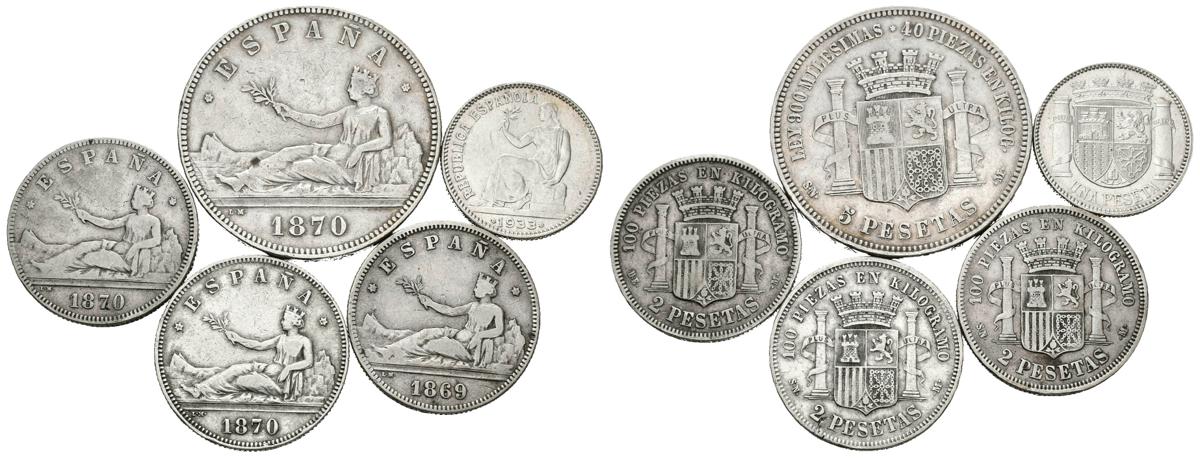 CENTENARIO DE LA PESETA. Lote compuesto por monedas de la I y II República, 1 Peseta de 1869, 1 Peseta de 1870, 5 Pesetas de 1870 y 1 Peseta de 1933. Ar. MBC-/EBC. A EXAMINAR.