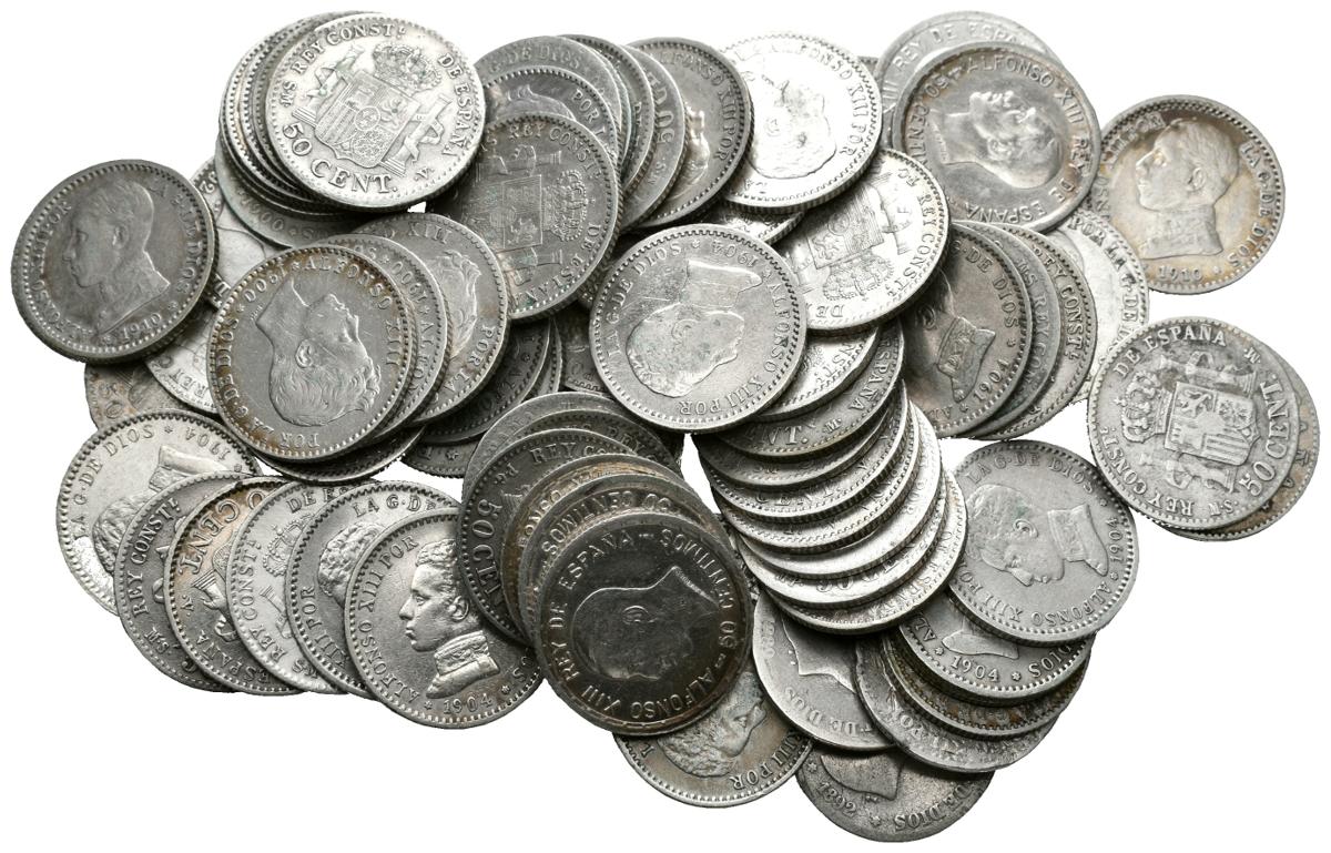 CENTENARIO DE LA PESETA. Lote compuesto por 74 monedas de 50 Céntimos del Gobierno Provisional, Alfonso XII y Alfonso XIII. Gran variedad de fechas con alguna escasa. Ar. BC/EBC. A EXAMINAR.